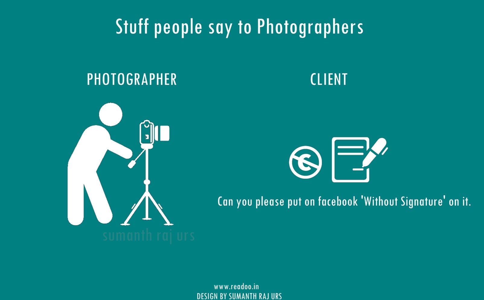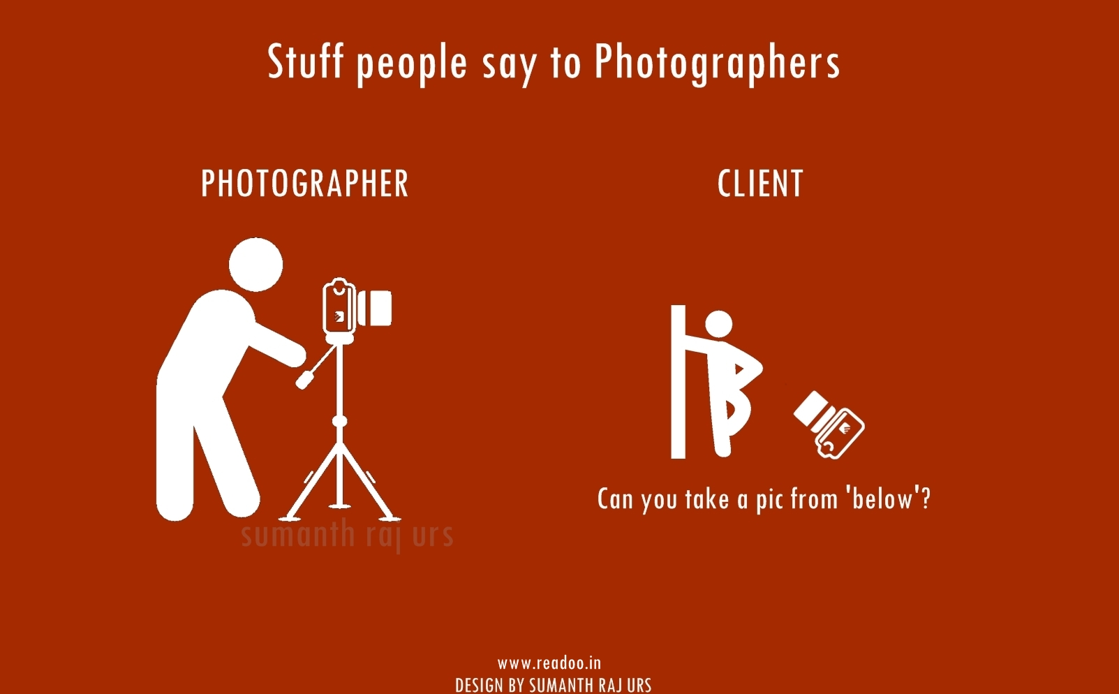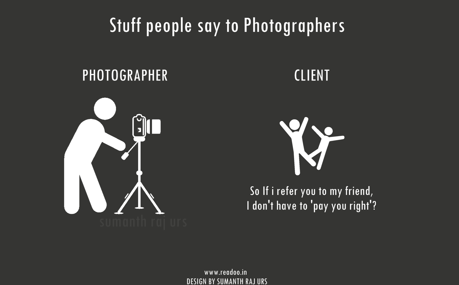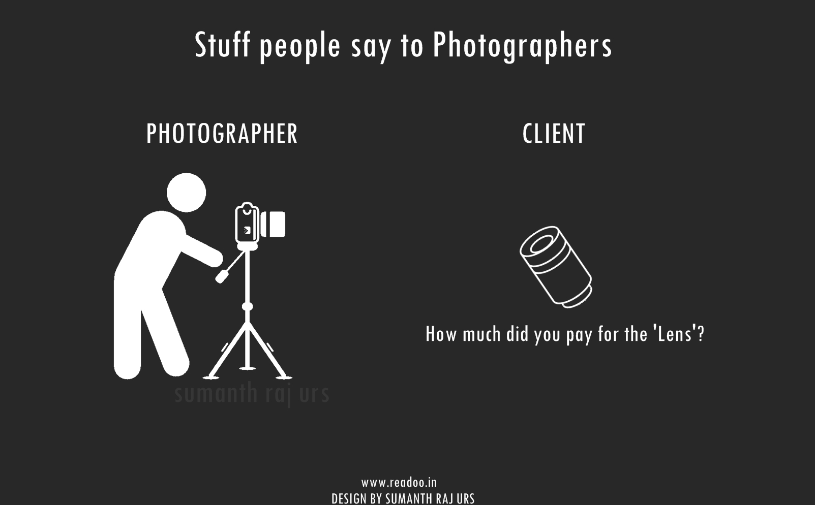 Youth Minimal Posters: 16 Stuff people say to the photographers Designs by Sumanth Raj Urs Guest Author Joining hands in the journey of Readoo.in, the guest authors will render you stories on anything under the sun.