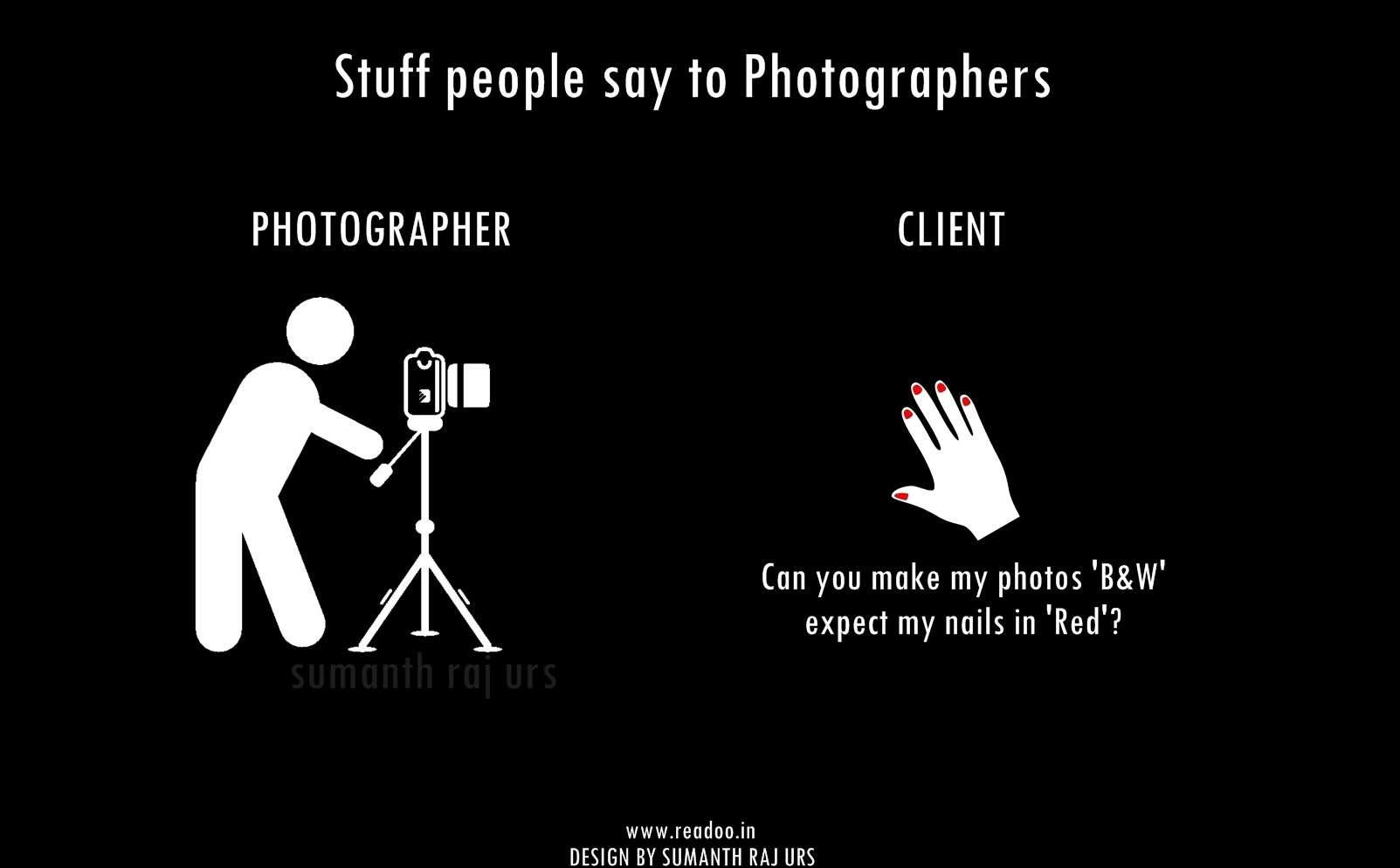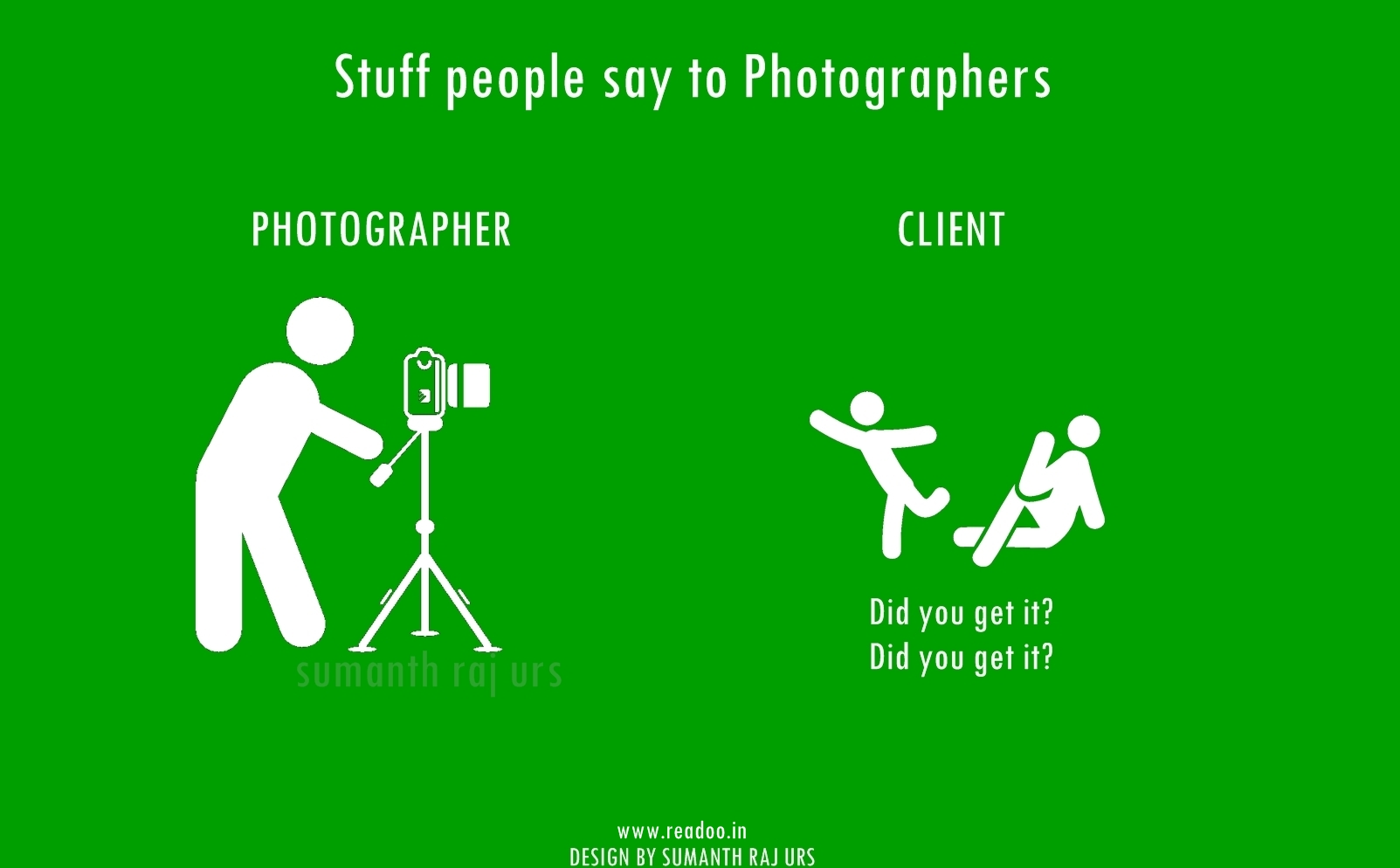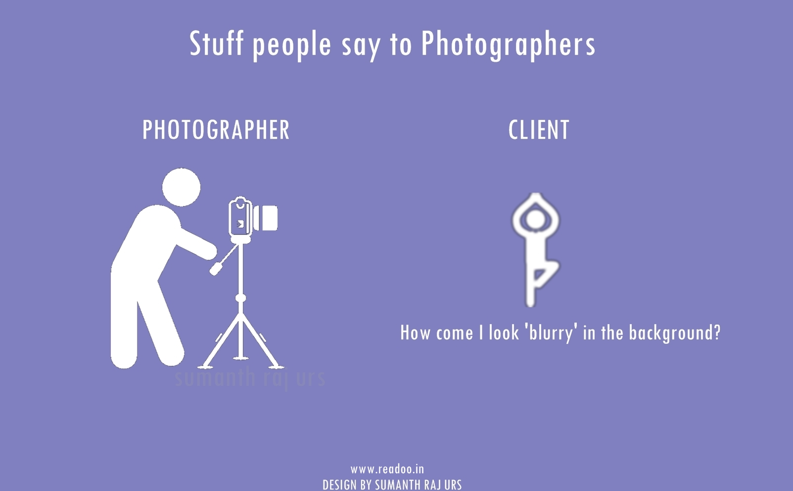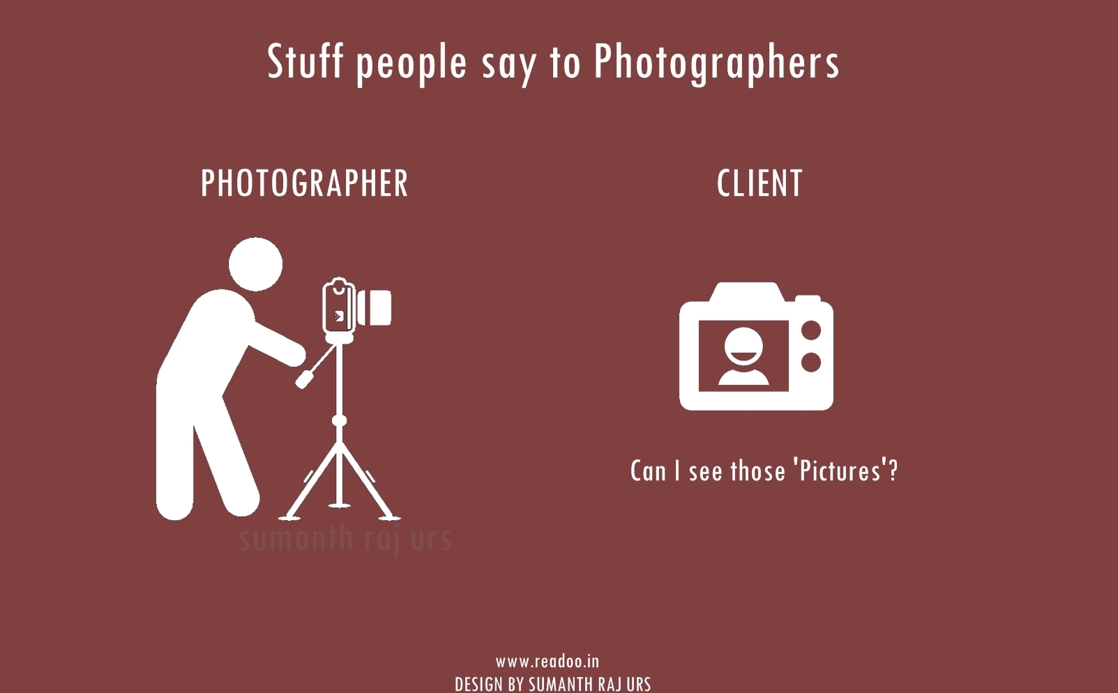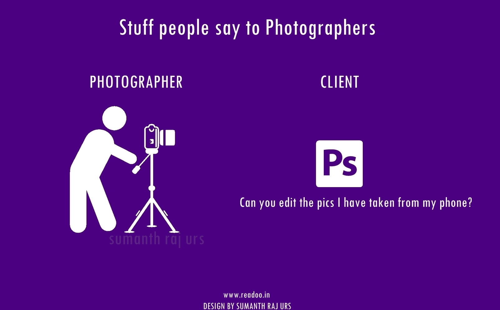 Youth Minimal Posters: 16 Stuff people say to the photographers Designs by Sumanth Raj Urs Guest Author Joining hands in the journey of Readoo.in, the guest authors will render you stories on anything under the sun.